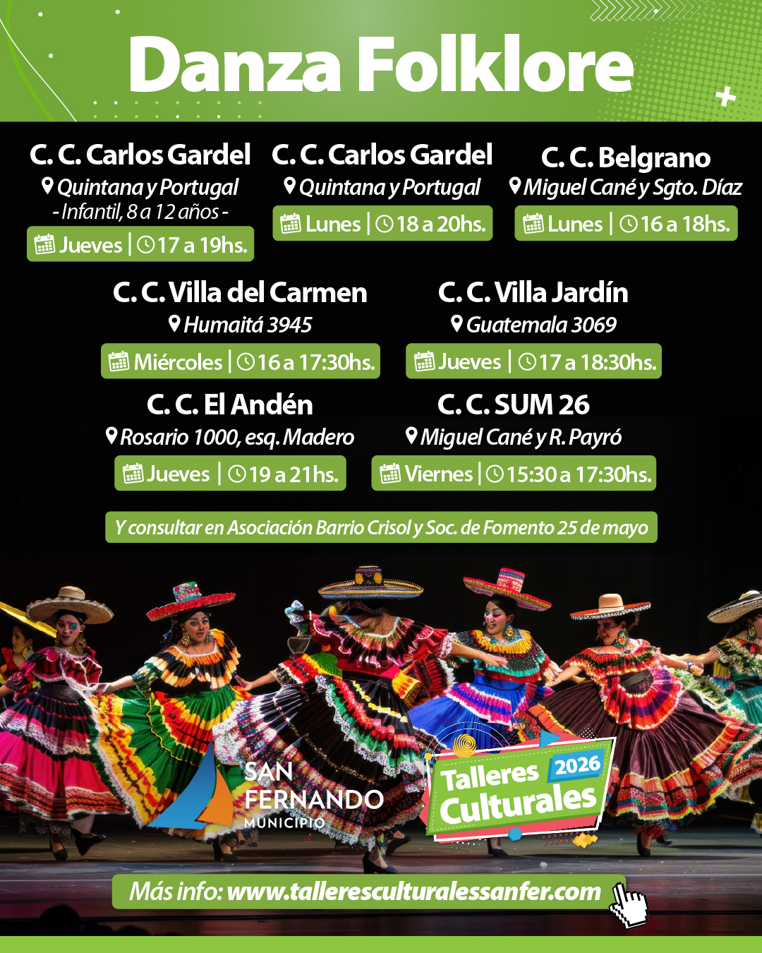 ¡Conectate con las raíces y tradiciones a través del movimiento! Este taller propone explorar la danza folclórica argentina mediante el aprendizaje de pasos, figuras y coreografías de distintos ritmos y regiones. Se abordan danzas como chacarera, zamba y gato, incorporando el trabajo en pareja y propuestas grupales. También se reconocen elementos de la vestimenta tradicional y las figuras del gaucho y la china, como parte del lenguaje cultural que atraviesa estas expresiones.